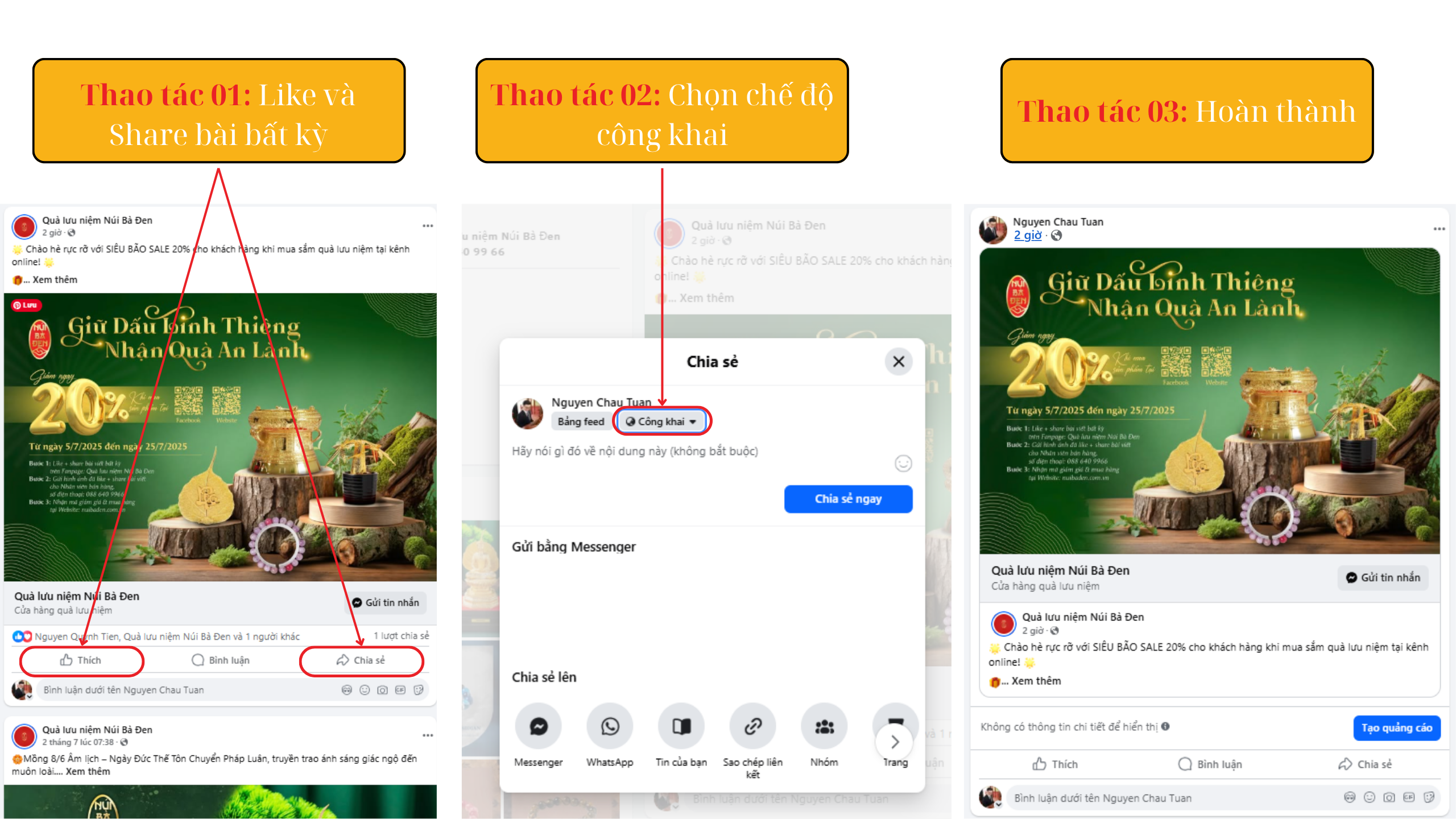 - Bước một, hãy truy cập fanpage Quà lưu niệm Núi Bà Đen và like cộng share bất kỳ bài viết nào ở chế độ công khai. Đây là cách để giúp nhiều người biết hơn về chương trình cũng như lan tỏa những điều tích cực từ hành trình hành hương của bạn.