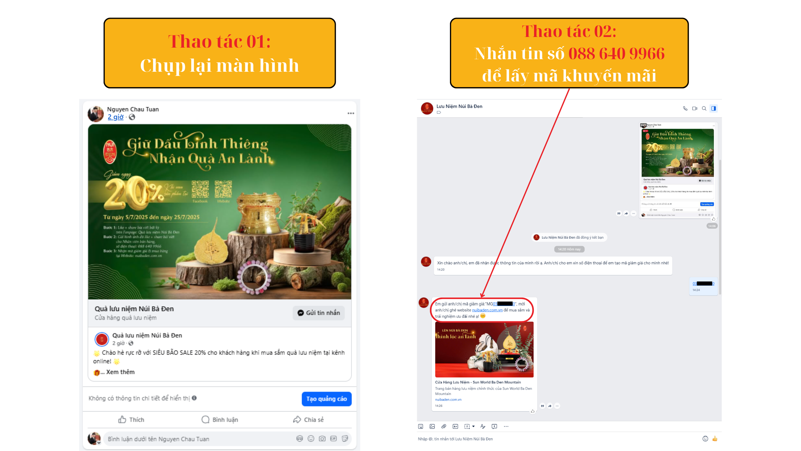 - Bước hai, chụp lại màn hình thể hiện bạn đã like và share bài viết, sau đó gửi ảnh này qua tin nhắn Zalo hoặc điện thoại đến số hotline 088 640 9966 để nhân viên cửa hàng xác nhận.