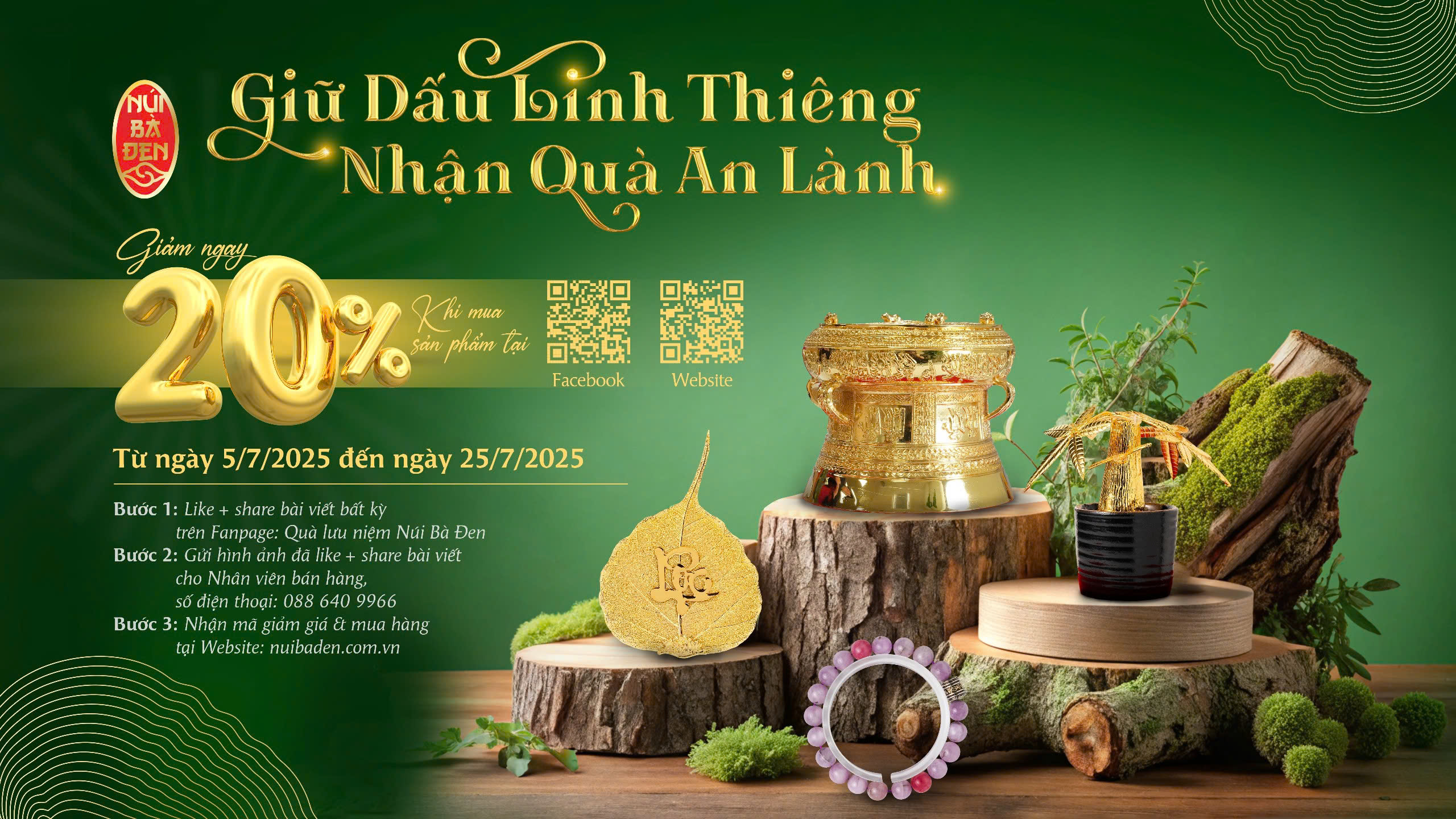 Nhằm lan tỏa tinh thần tốt đẹp ấy đến với nhiều du khách hơn nữa, từ ngày 5 tháng 7 đến hết ngày 25 tháng 7 năm 2025, Cửa hàng lưu niệm Sun World Ba Den Mountain triển khai chương trình ưu đãi đặc biệt giảm ngay 20% cho tất cả các đơn hàng mua online. Đây là một trong những chương trình khuyến mãi lớn nhất trong năm, dành cho khách hàng yêu thích những sản phẩm thủ công, văn hóa và phong thủy mang dấu ấn Núi Bà.